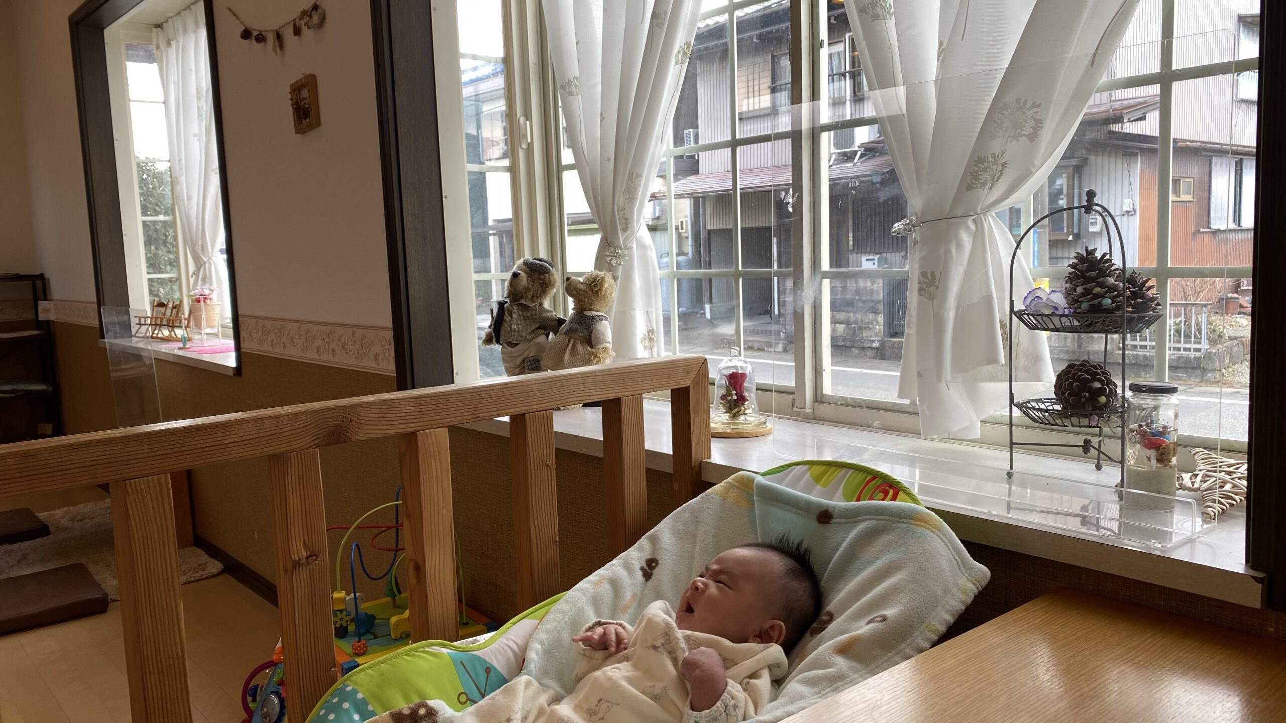 奥の席にはバウンサーが用意されていて、新生児でも寝かせられます。